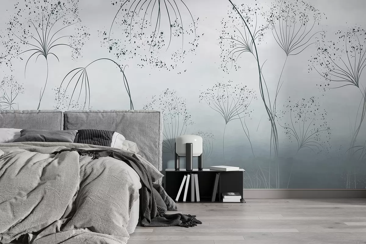 Fototapeter Blå, høye, spinkle planter med delikate, paraplyformede blomster eller frøhoder i et tåkete, stemningsfullt miljø Nr. w08258v1