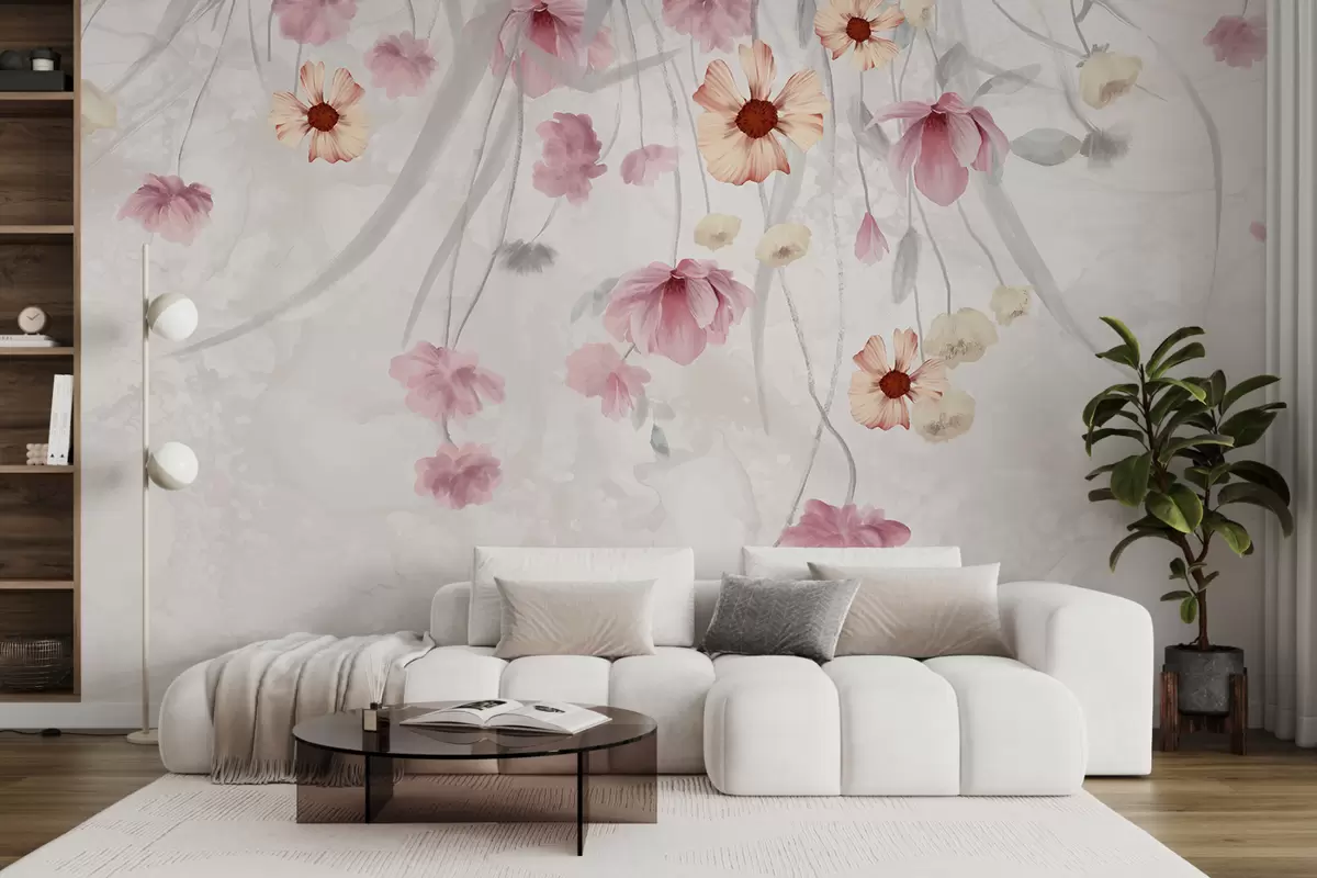 Fototapeter Delikate pastellrosa og gule blomster med gult senter som faller nedover en myk, uskarp bakgrunn Nr. w08261v1