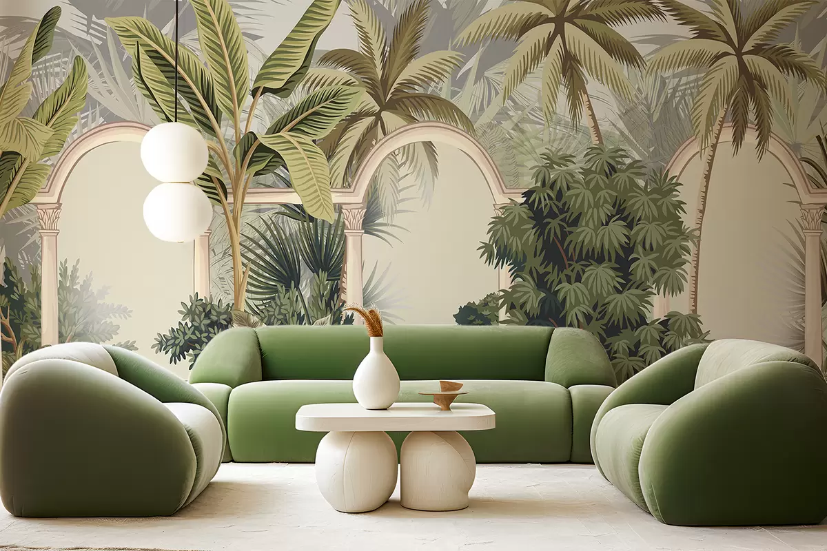 Fototapeter Buer med tropisk landskap, frodige palmer og annet løvverk mot en lys bakgrunn Nr. w08306