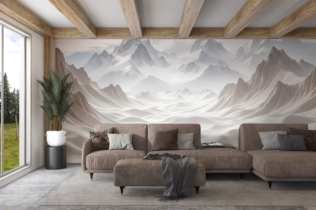 Fototapeter Snødekte fjelltopper dukker opp fra et tåkete, eterisk landskap med bølgende åser og daler Nr. w08313