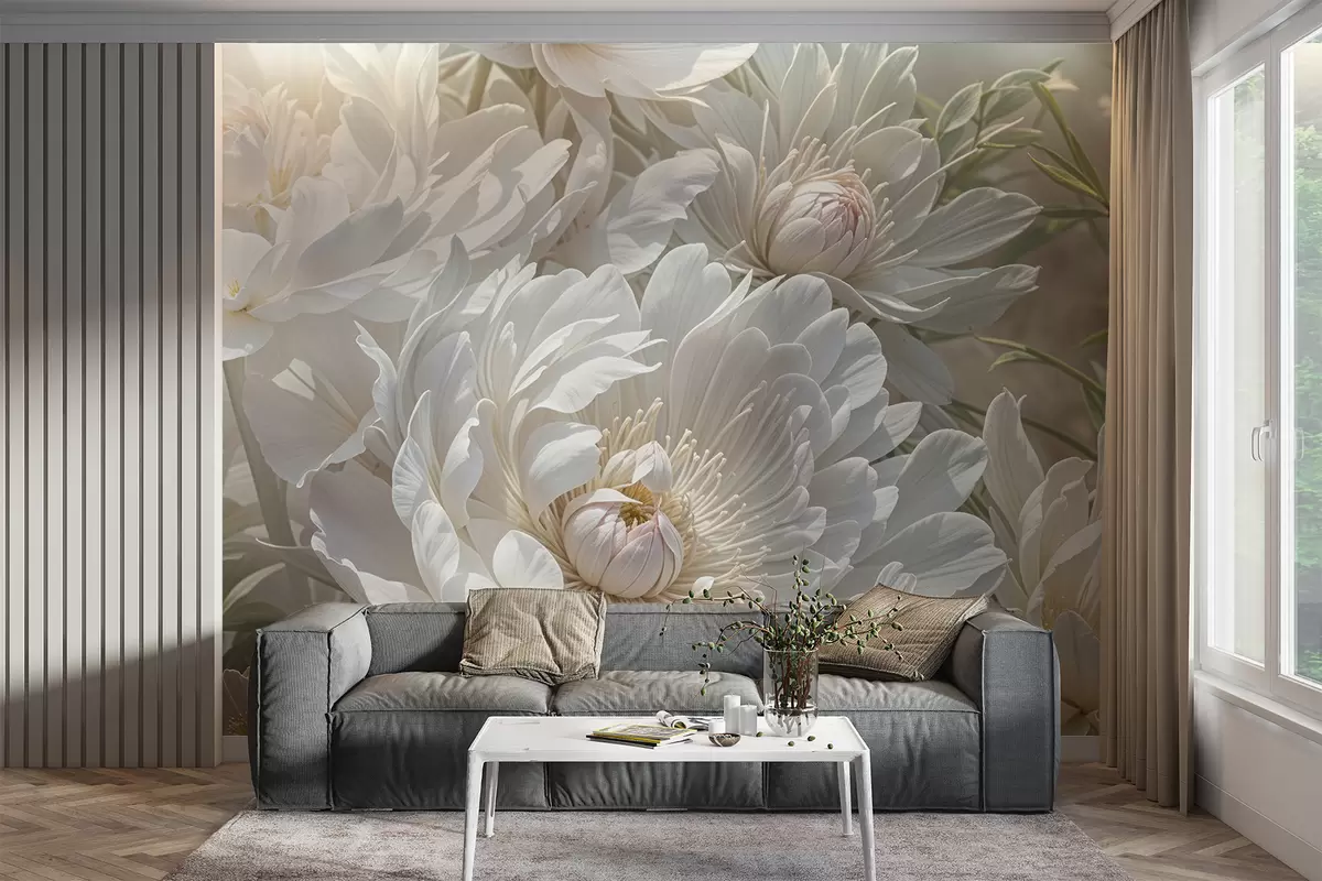 Fototapeter Nærbilde av store, delikate, hvite pionblomster med myke, luftige kronblader og blekgult sentrum Nr. w08325
