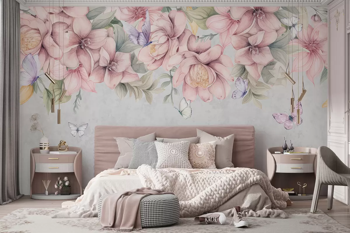 Fototapeter Myke rosa og hvite blomster med delikate blomster og blader på en grå bakgrunn med struktur Nr. w08331