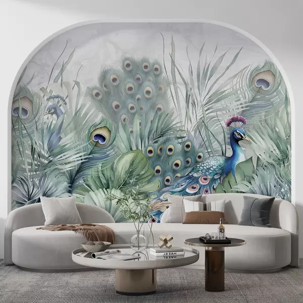 Fototapeter Et par fargerike påfugler omgitt av frodig akvarellgrønt løvverk og livlige blomster på grå bakgrunn Nr. w08345