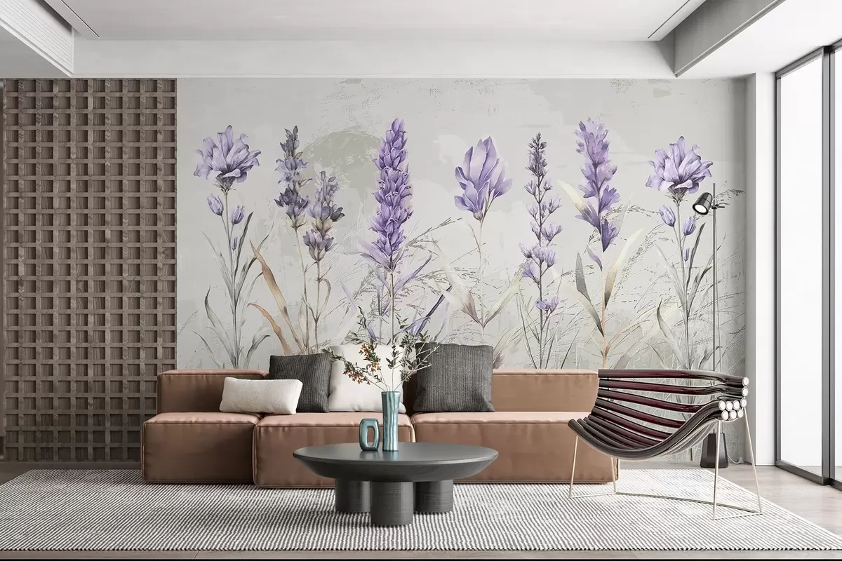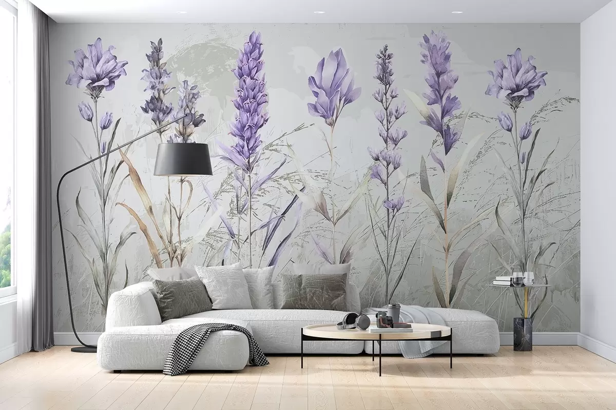 Fototapeter Et felt med lilla akvarellfargede lavendelblomster med en myk, uskarp teksturert beige bakgrunn Nr. w08346