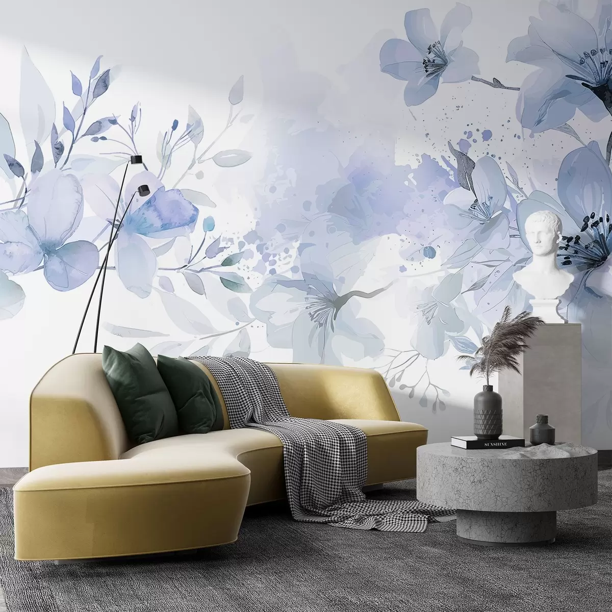 Fototapeter En bukett med delikate blå og hvite blomster med myke, uskarpe kronblader mot en lett, luftig akvarellbakgrunn Nr. w08348v1