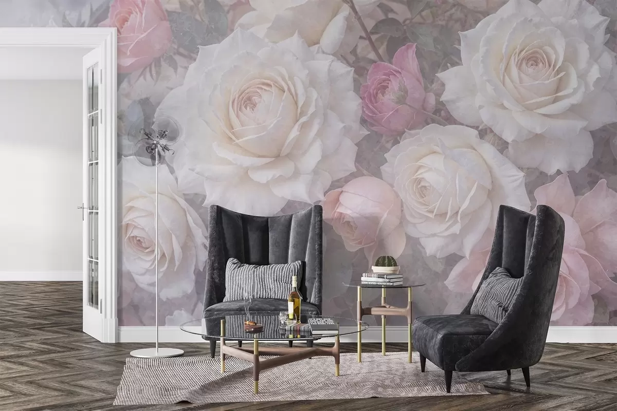 Fototapeter Myke, pastellfargede roser og pioner mot en uskarp, tåkegrå teksturert bakgrunn Nr. w08352