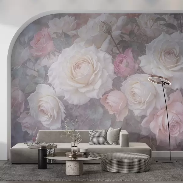 Fototapeter Myke, pastellfargede roser og pioner mot en uskarp, tåkegrå teksturert bakgrunn Nr. w08352