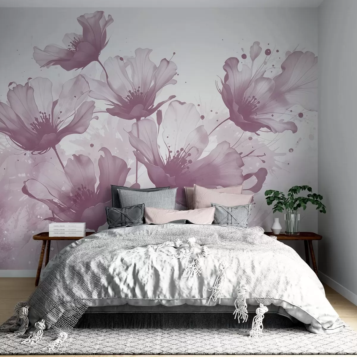 Fototapeter Delikate rosa blomster med myke, uskarpe kronblader og akvarellstænk mot en lys bakgrunn Nr. w08376v2