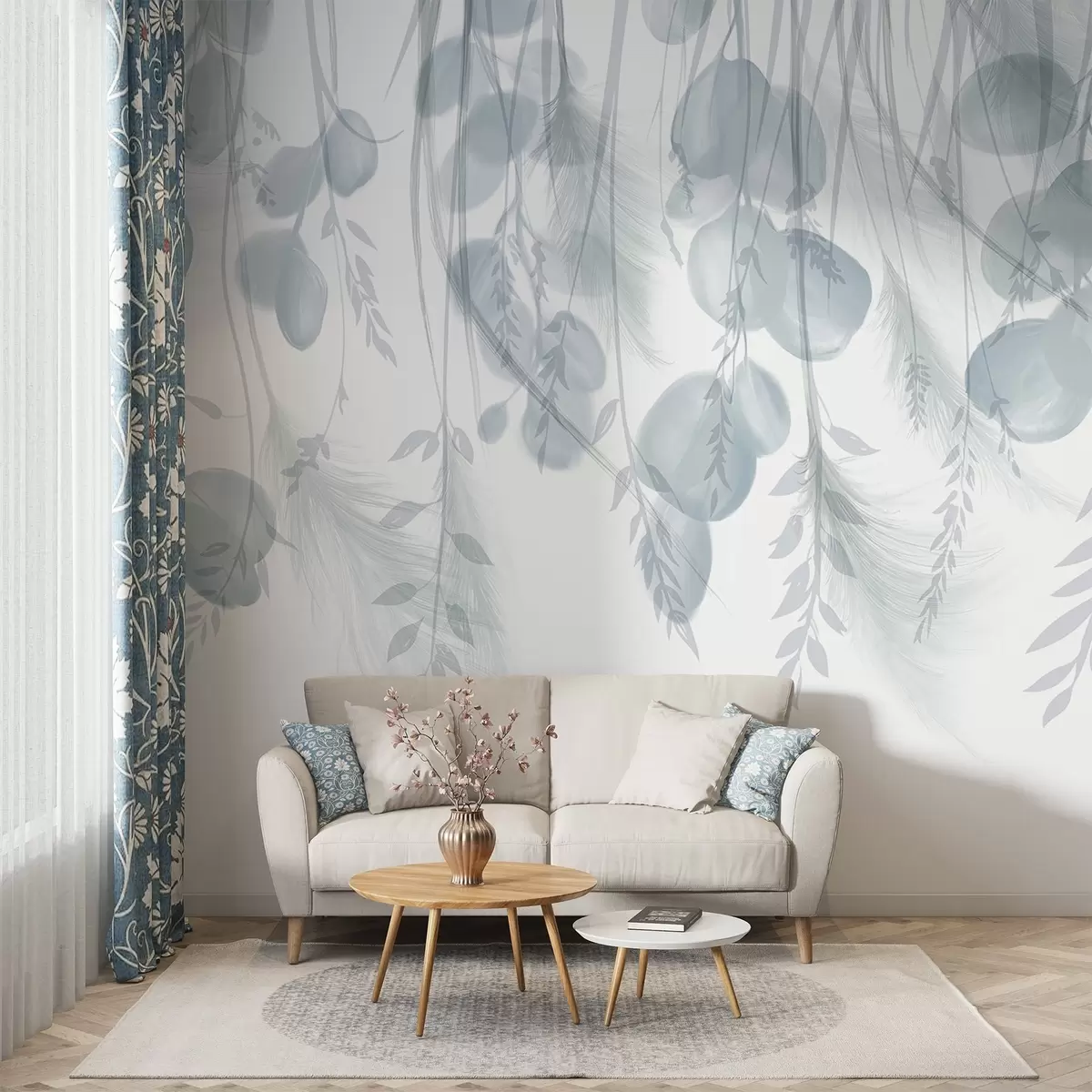 Fototapeter Delikate grå og pastellgrønne eukalyptusblader som faller og skaper en rolig og beroligende atmosfære Nr. w08380