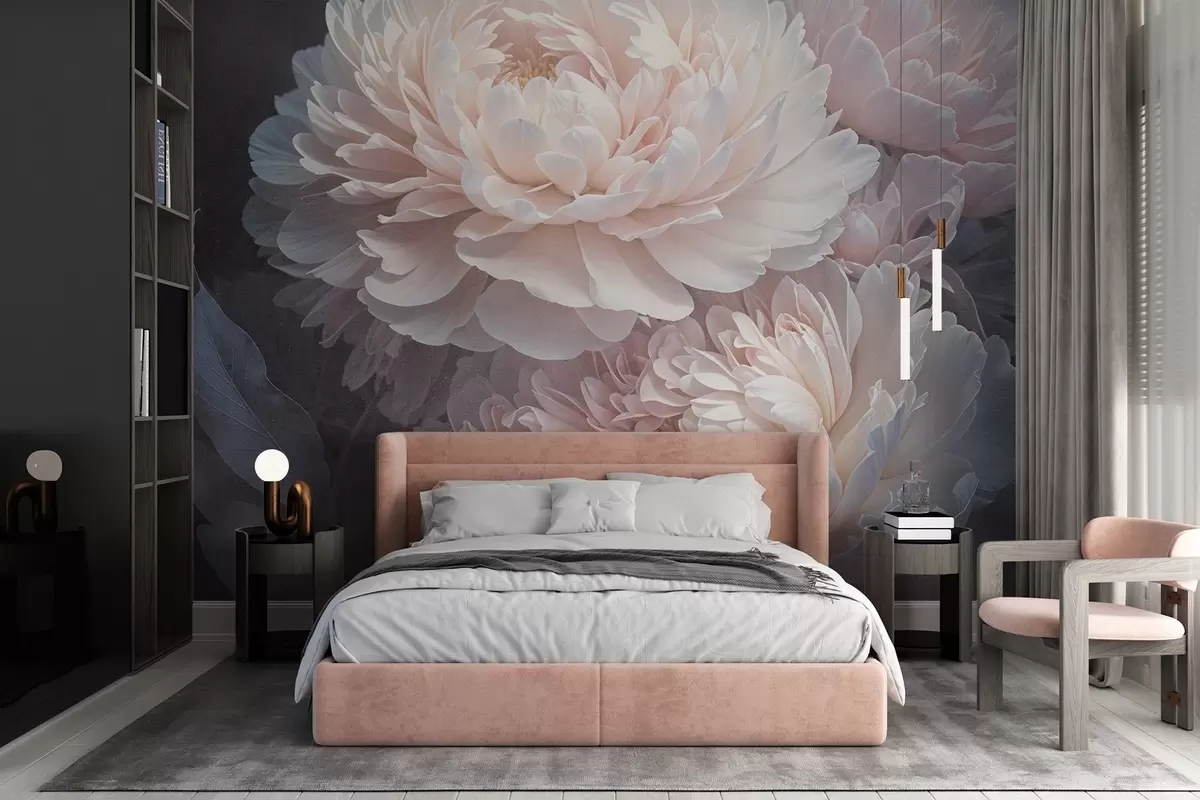 Fototapeter Nærbilde av to store, delikate rosa pioner med myke, luftige kronblader og blader mot en uskarp bakgrunn Nr. w08382