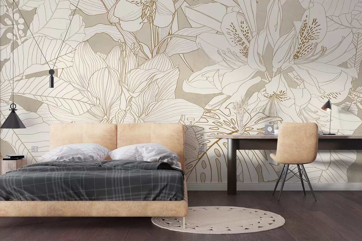 Fototapeter Detaljert pastellgult blomstertrykk med ulike typer blomster og blader, et frodig, intrikat botanisk design Nr. w08385v1