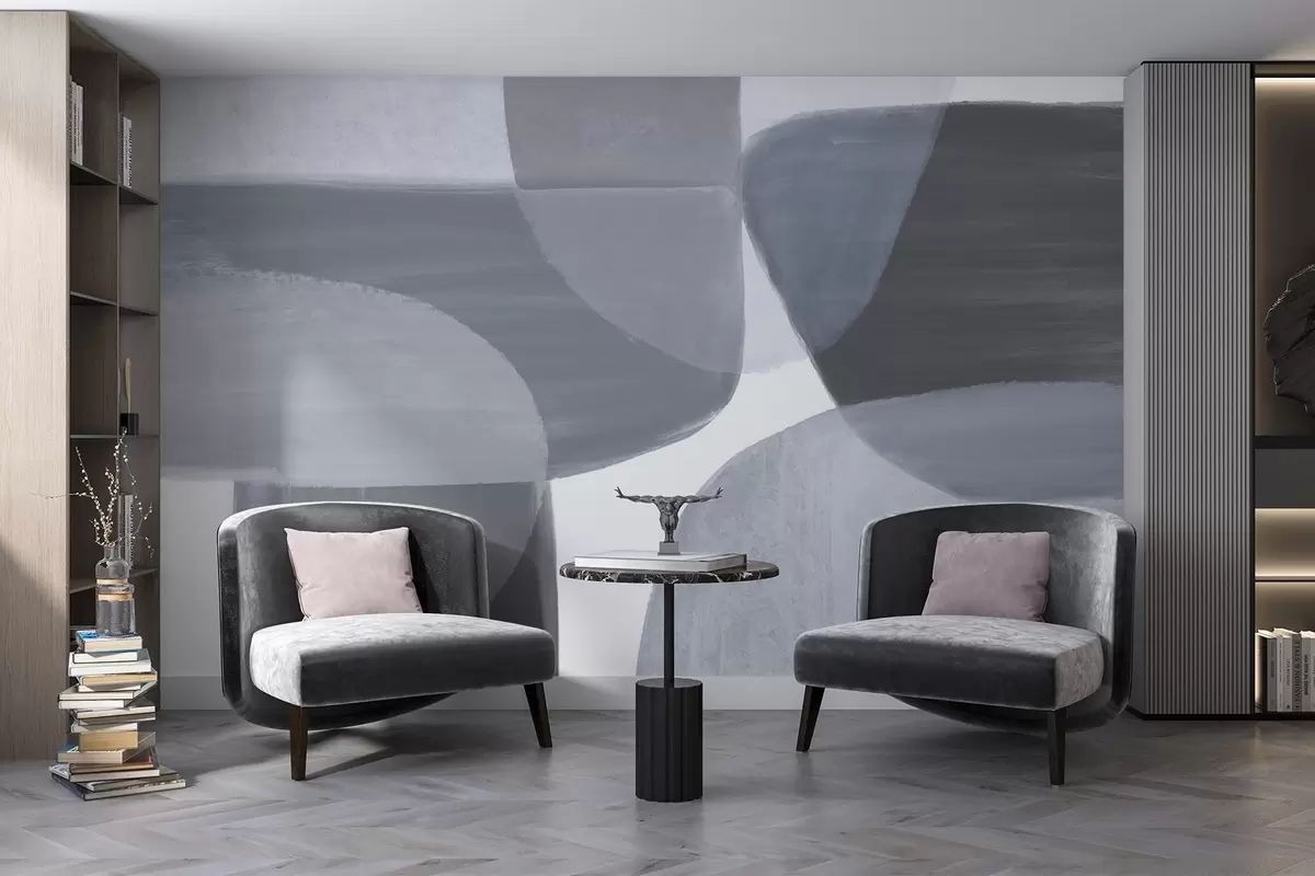 fototapeter Et monokromt, abstrakt trykk med overlappende minimalistiske former og figurer i grå og blå nyanser w08410