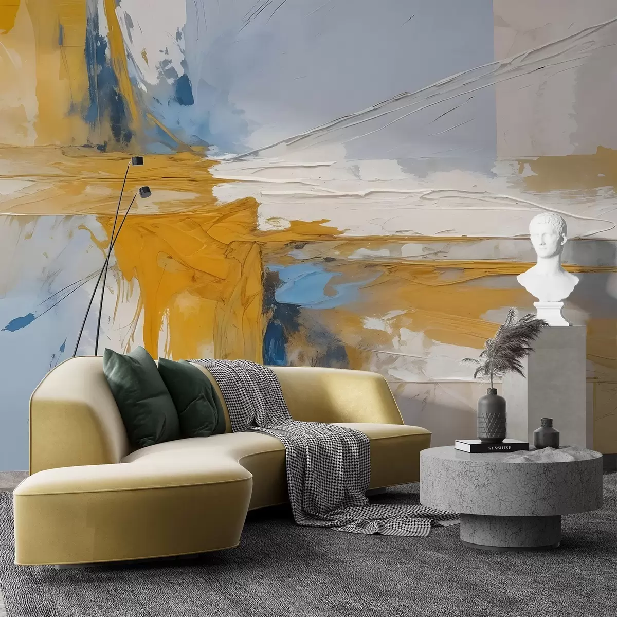 Fototapeter Minimalistisk, abstrakt kunstkomposisjon med kraftige penselstrøk i gult, blått og hvitt Nr. w08414