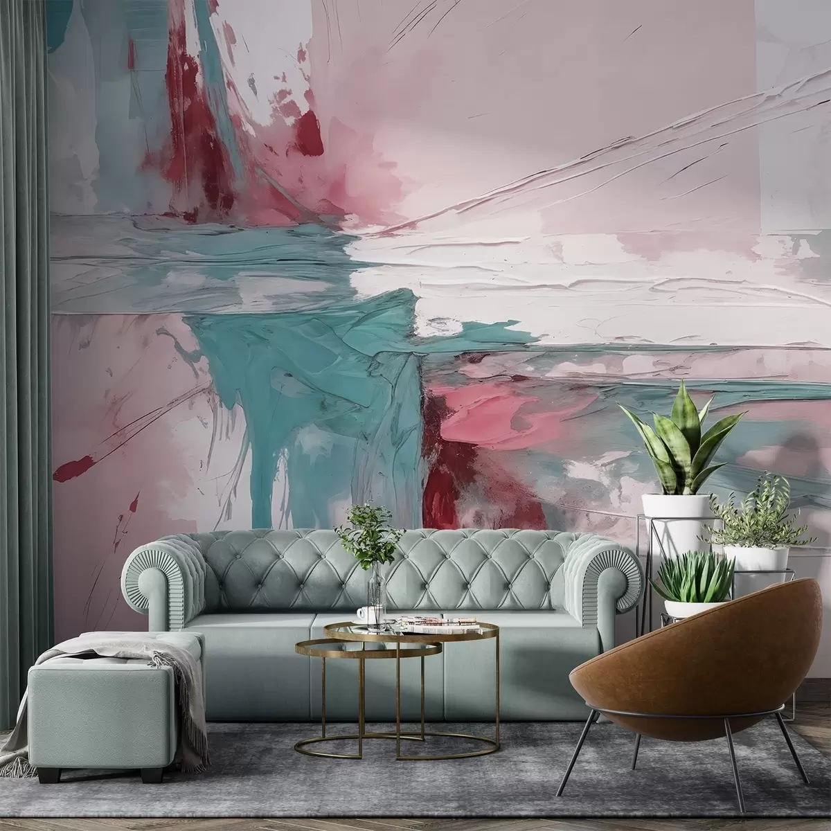 Fototapeter Minimalistisk, abstrakt kunstkomposisjon med dristige penselstrøk i rosa, blå og hvit maling Nr. w08414v1