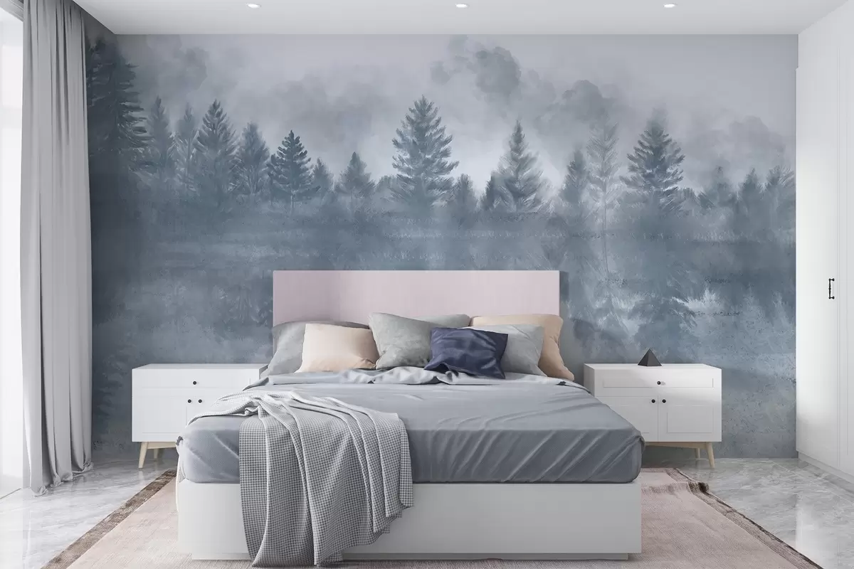 Fototapeter Et rolig landskap med en frossen innsjø omgitt av en tett furuskog, med en tåkete og disig atmosfære Nr. w08415