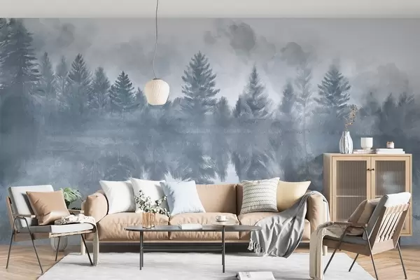 Fototapeter Et rolig landskap med en frossen innsjø omgitt av en tett furuskog, med en tåkete og disig atmosfære Nr. w08415
