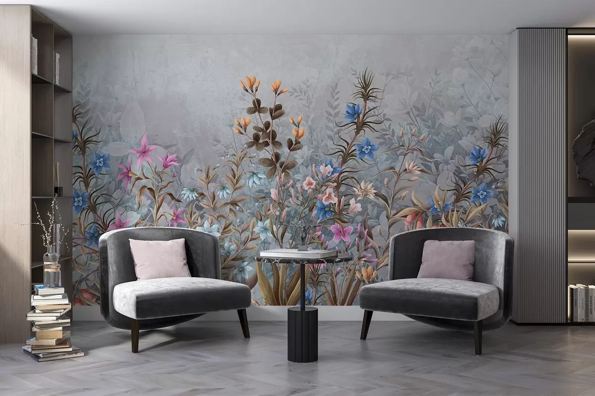 Fototapeter Et frodig, levende blomstertrykk med fargerike blomster og planter med intrikate detaljer og teksturer Nr. w08428