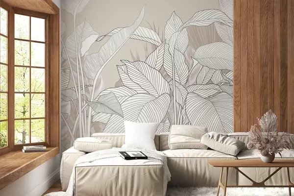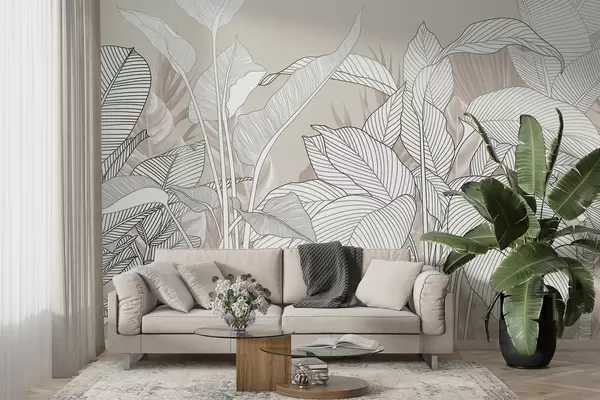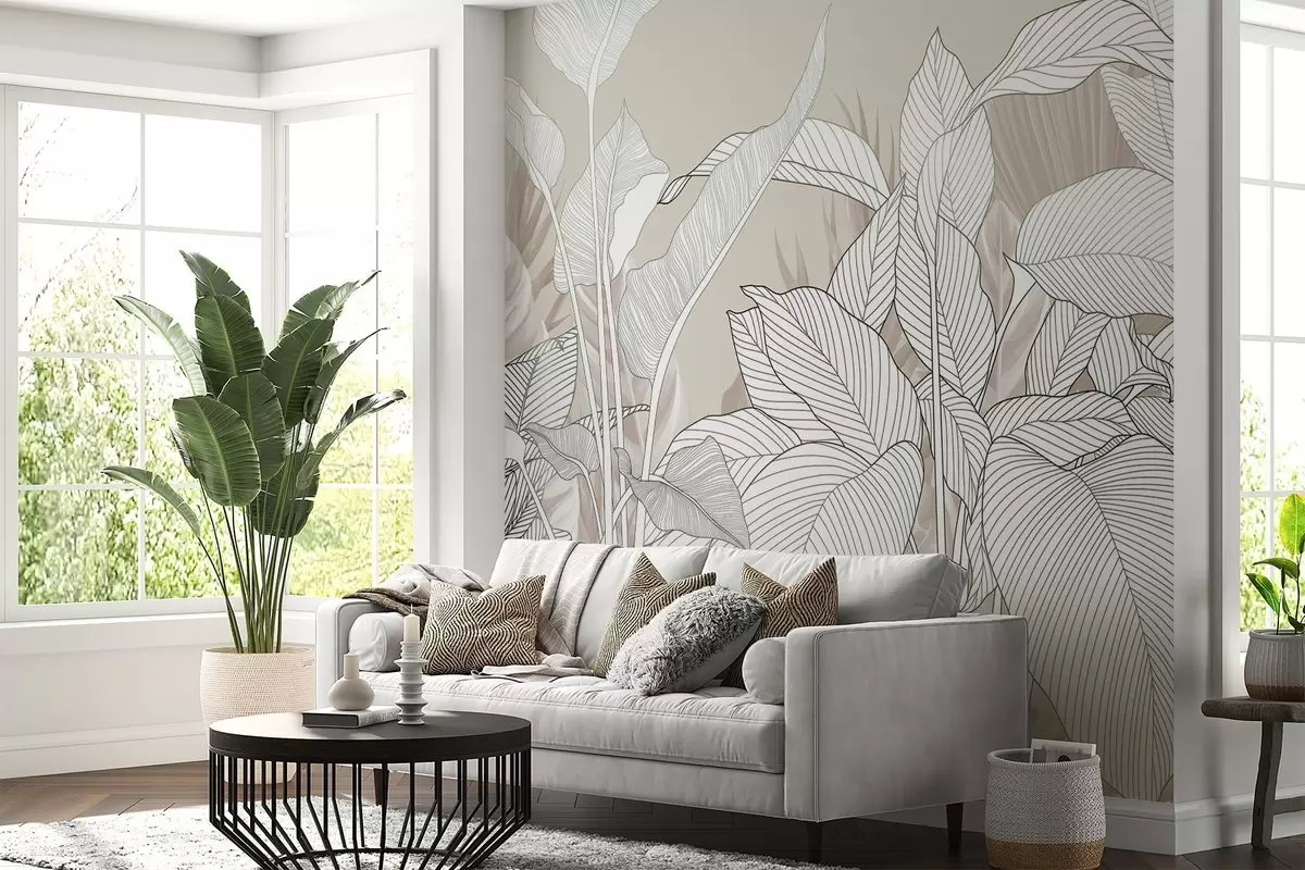 Fototapeter En monokrom illustrasjon med store, stiliserte blader og bladverk med intrikate strekmønstre og teksturer Nr. w08436v1