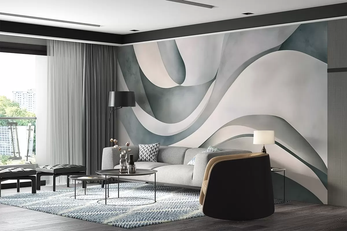 fototapeter Hvite, blå og grå buede former og former som skaper abstrakte, teksturelle, moderne og minimalistiske trykk  w08439v1