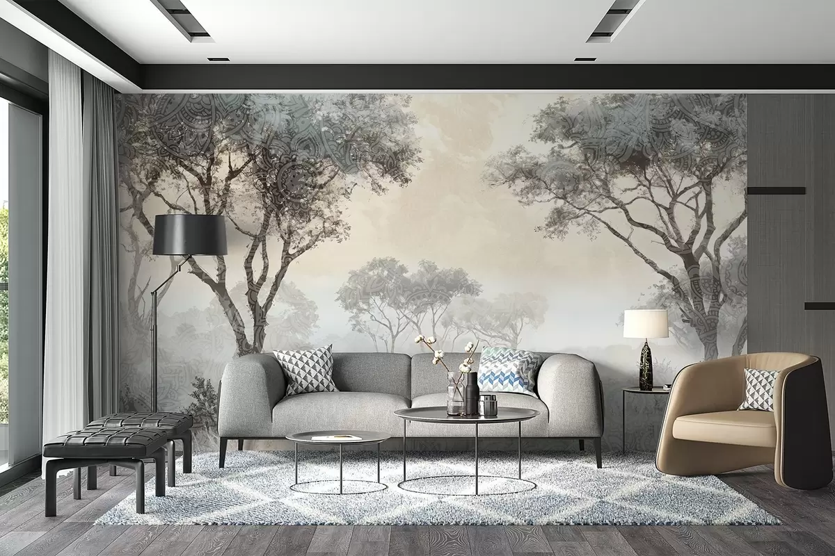 Fototapeter Et tåkete, fredfylt landskap med silhuettformede trær i forgrunnen og myk tåke i grå og beige nyanser Nr. w08442v1