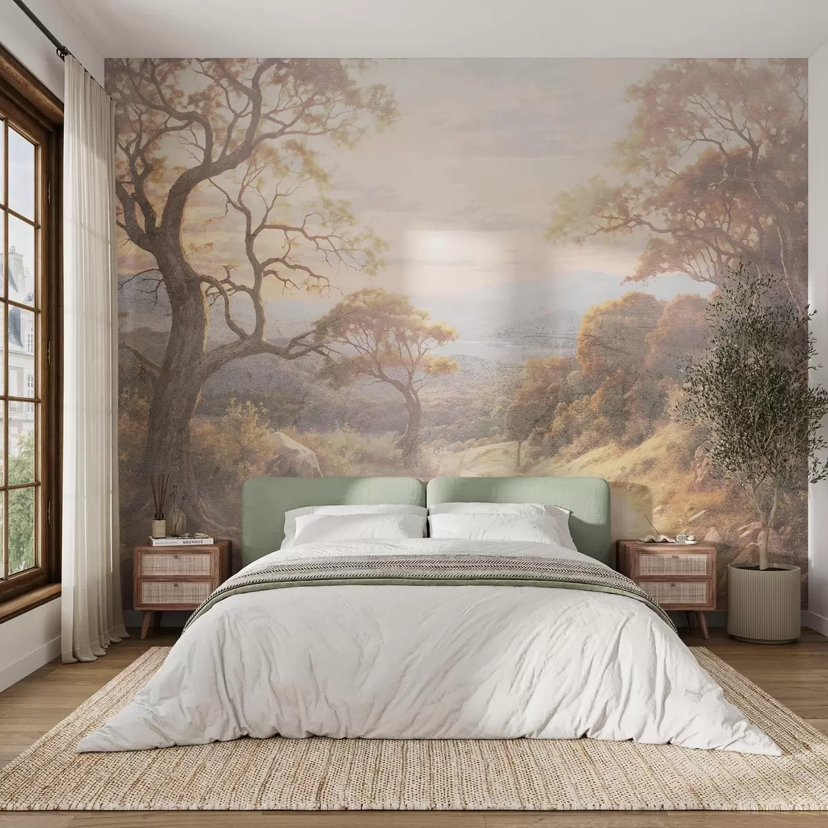 Fototapeter En svingete grussti gjennom en frodig høstskog med høye, krokete trær og varmt sollys Nr. w08446