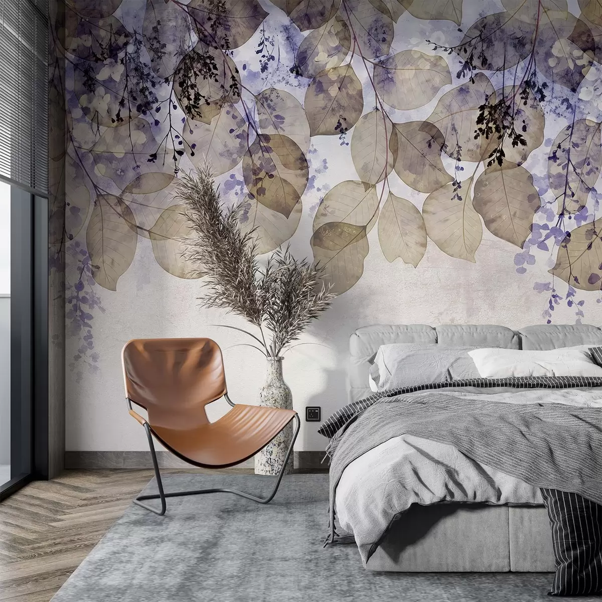 Fototapeter Delikate tørkede blader og blomster i nyanser av lilla, beige og hvitt mot en lett strukturert bakgrunn Nr. w08447