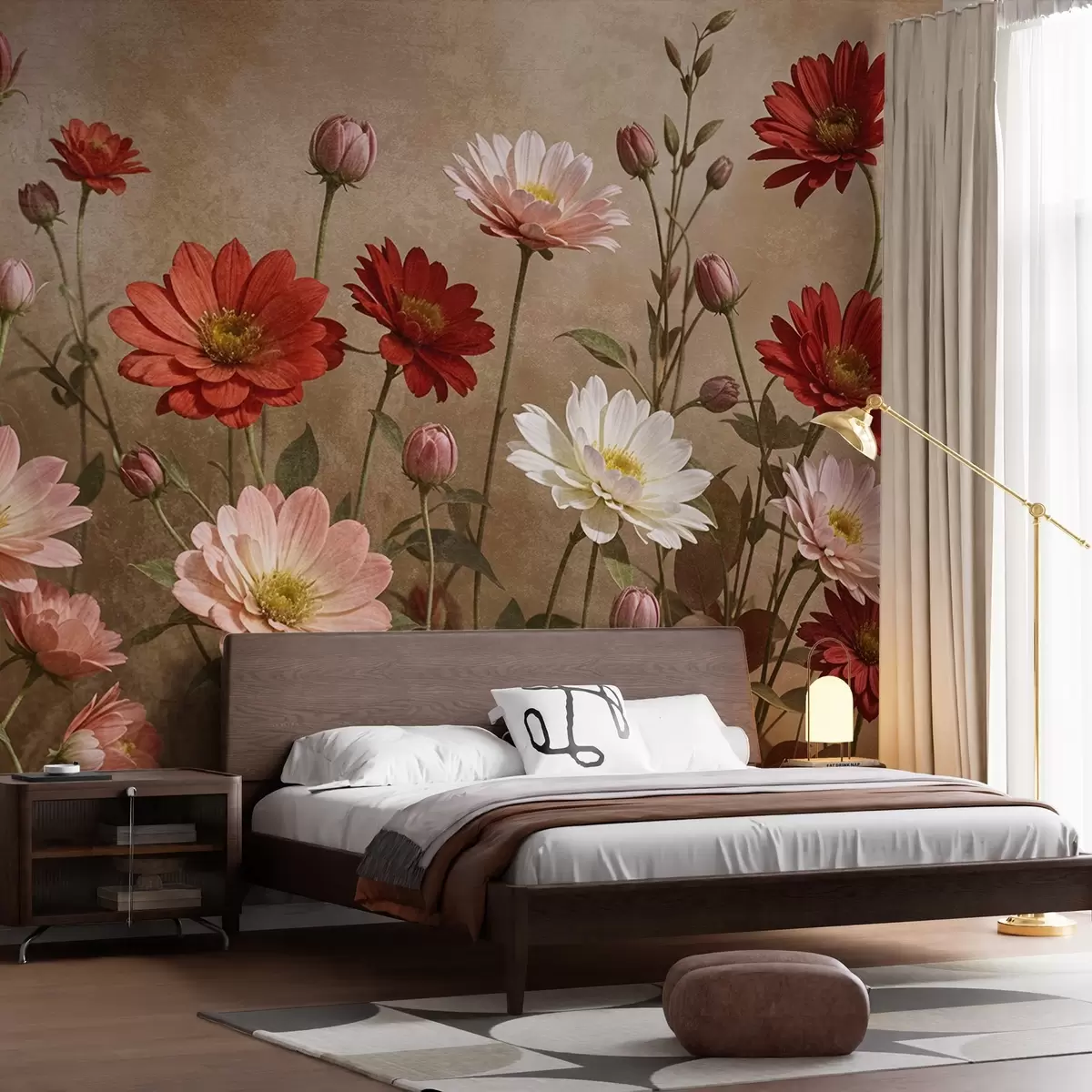 Fototapeter Et felt med fargerike tusenfrydlignende blomster i ulike nyanser av rosa , rødt og hvitt mot en strukturert bakgrunn Nr. w08462