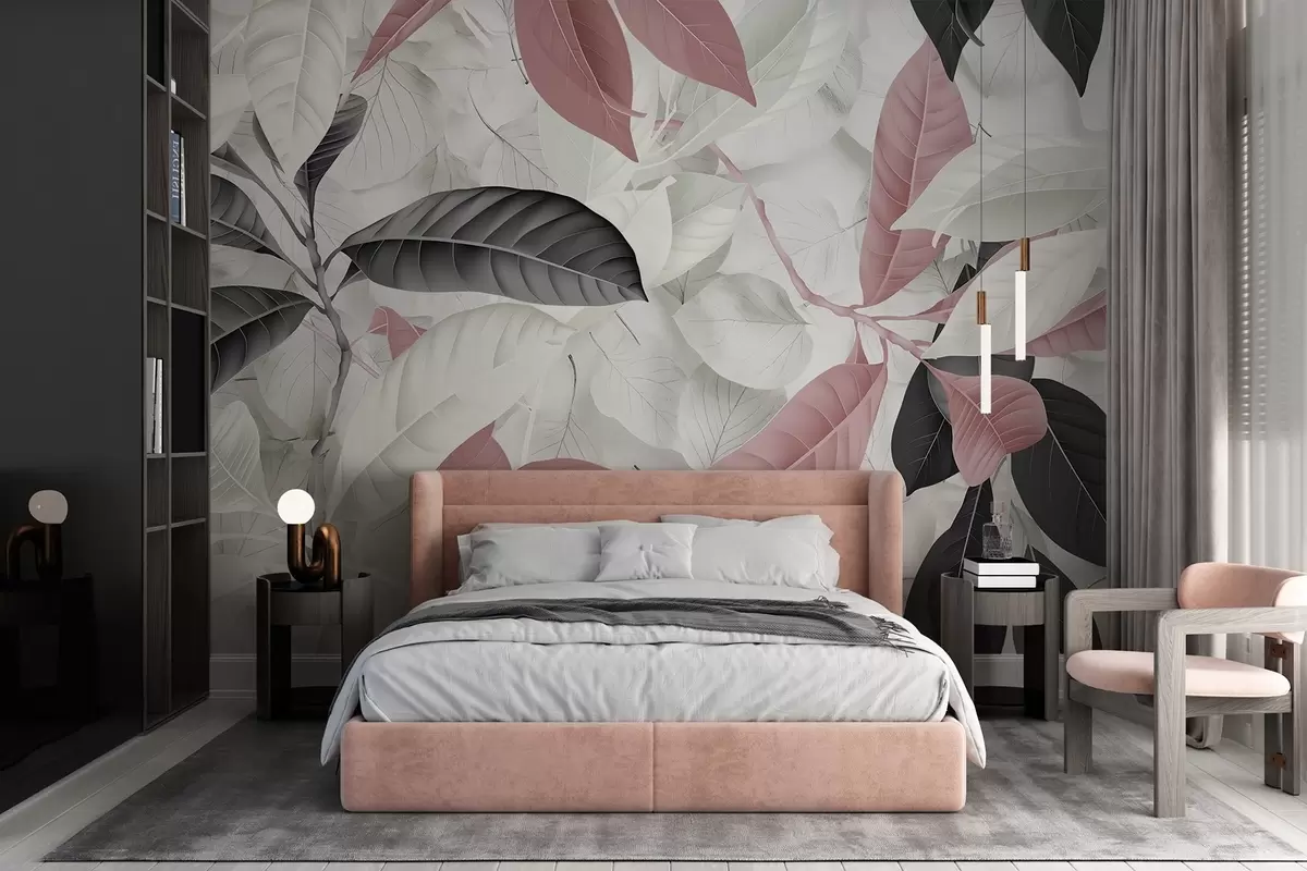 Fototapeter Stort trykk av rosa og grå blader mot en bakgrunn med lys bladstruktur, noe som skaper en frodig tropisk følelse Nr. w08468