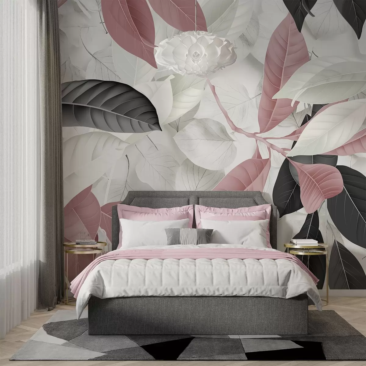 Fototapeter Stort trykk av rosa og grå blader mot en bakgrunn med lys bladstruktur, noe som skaper en frodig tropisk følelse Nr. w08468
