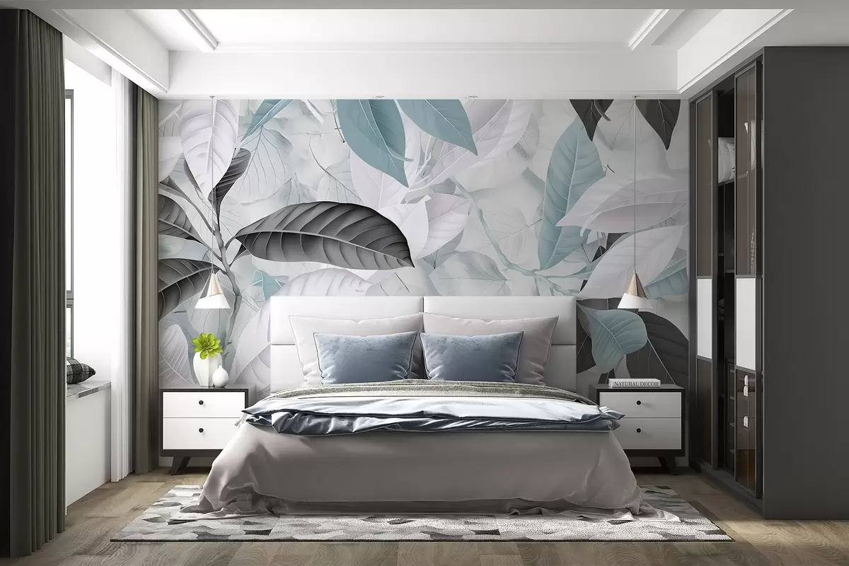 Fototapeter Stort trykk av blå og grå blader mot en bakgrunn med lys bladstruktur, noe som skaper en frodig tropisk følelse Nr. w08468v1