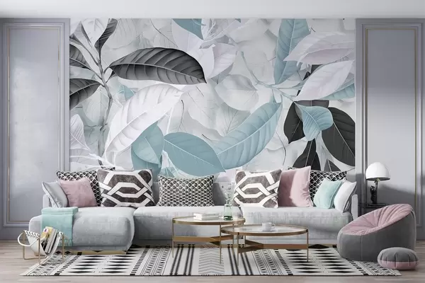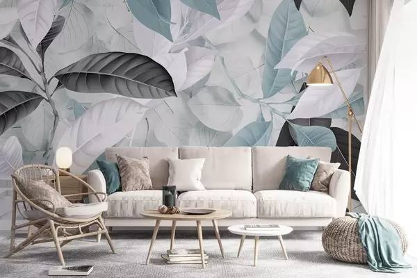 Fototapeter Stort trykk av blå og grå blader mot en bakgrunn med lys bladstruktur, noe som skaper en frodig tropisk følelse Nr. w08468v1