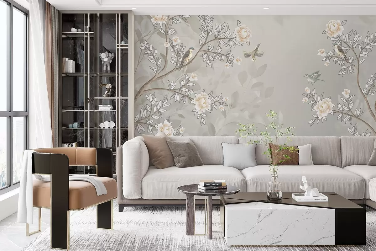 Fototapeter Grener med roser og flygende fugler i lyse toner Nr. w08493