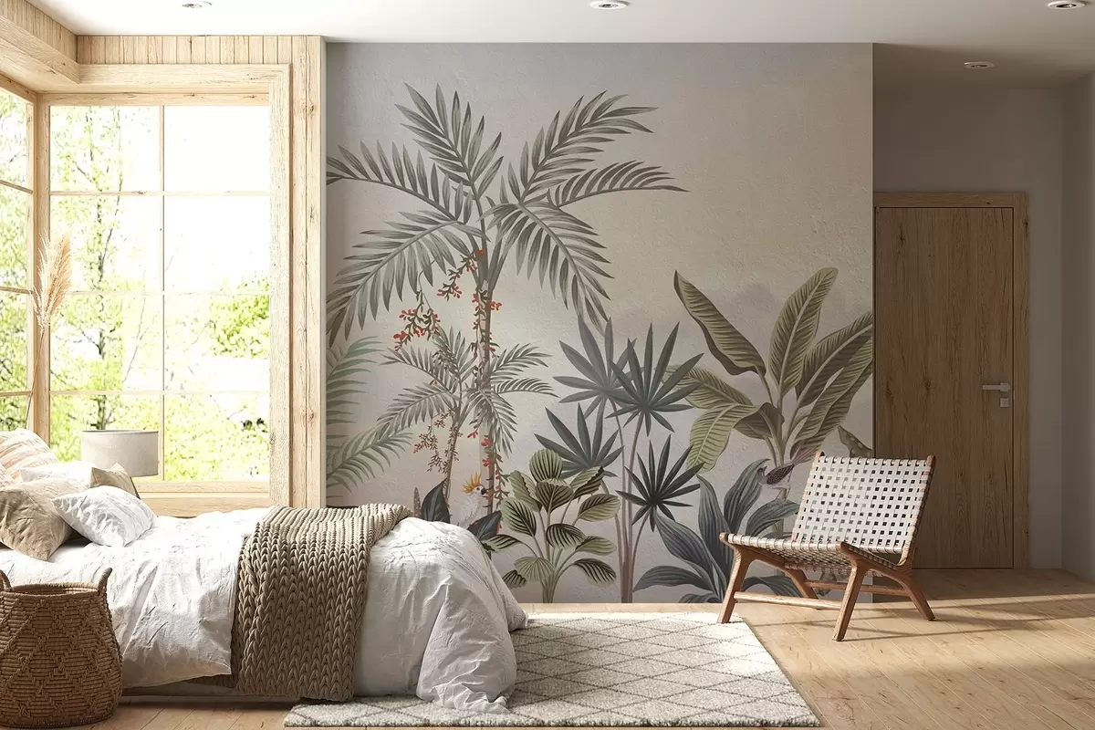 Fototapeter Tropisk jungel med palmer og fargerike fugler Nr. w08496