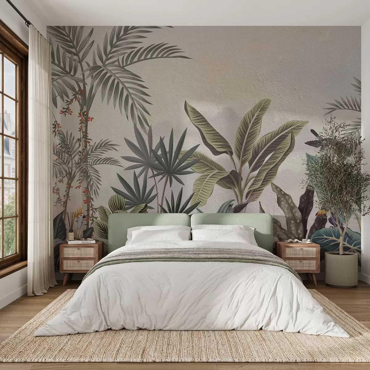 Fototapeter Tropisk jungel med palmer og fargerike fugler Nr. w08496