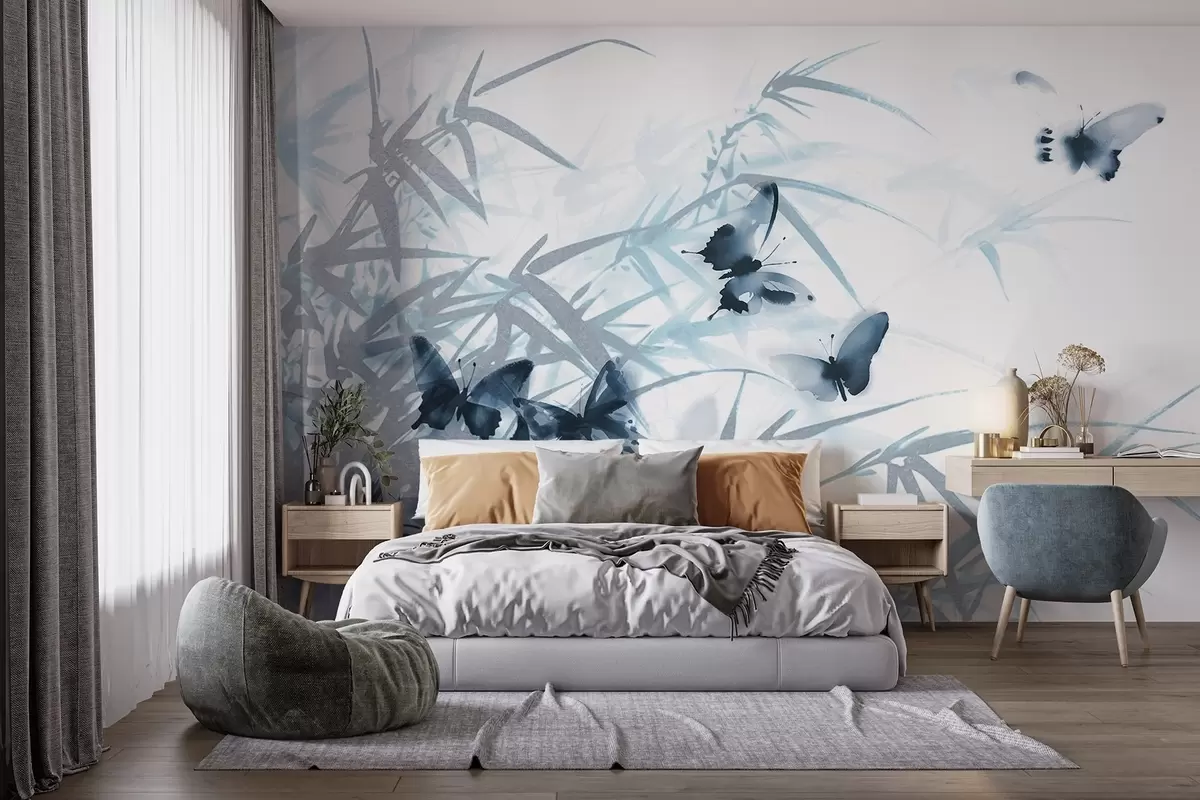 Fototapeter Bambusblader og stengler med tekstur og flygende blå sommerfugler med gjennomsiktige vinger Nr. w08524
