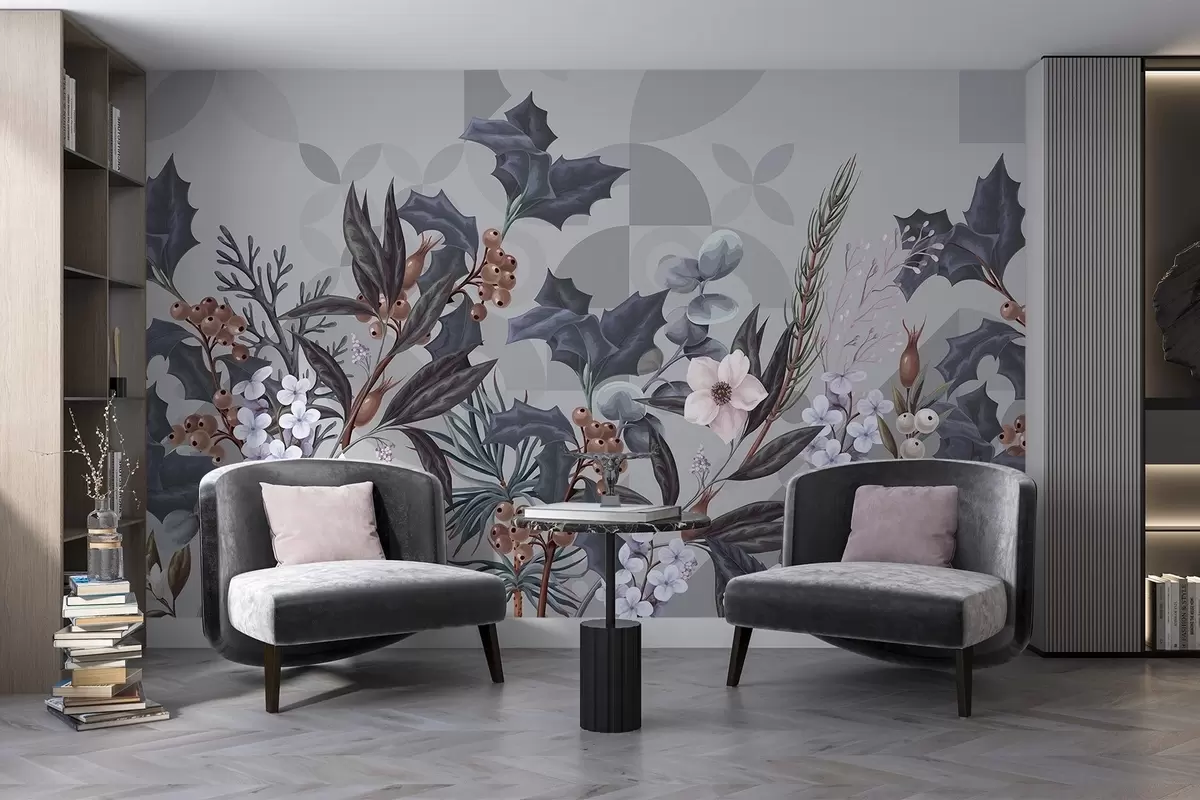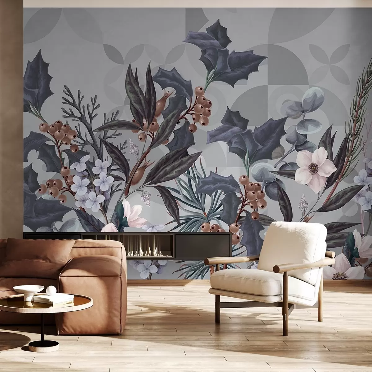 Fototapeter Blomsteroppsats med store mørke blader, blomster og bær på en dempet grå, geometrisk og abstrakt bakgrunn Nr. w08525