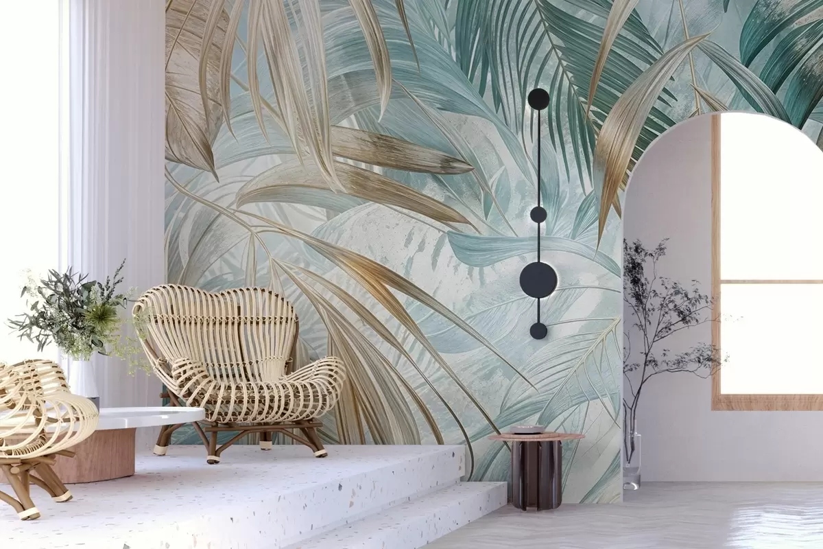 Fototapeter Et tropisk, abstrakt blomstertrykk med store palmeblader i blå og beige nyanser skaper en frodig atmosfære Nr. w08532