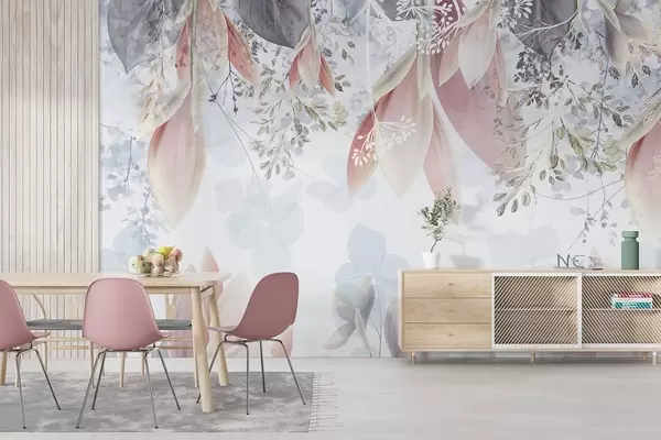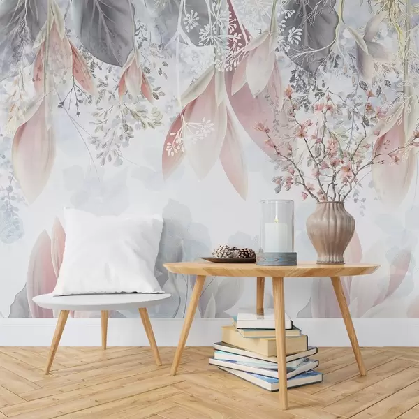 Fototapeter Mykt, pastellfarget blomstertrykk med delikate kronblader og blader i nyanser av rosa, hvitt og grått Nr. w08538