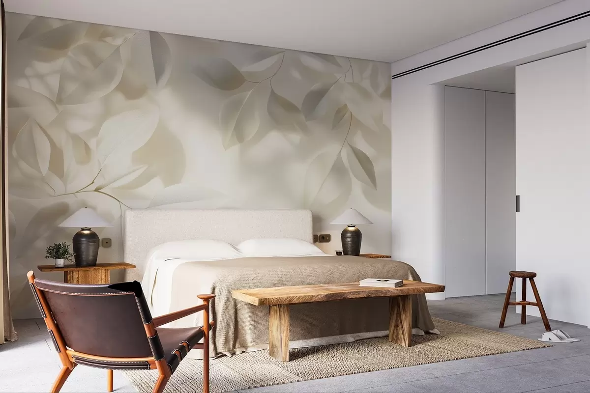 Fototapeter Hengende hvite grener med blader mot en vegg med sollys Nr. w08552