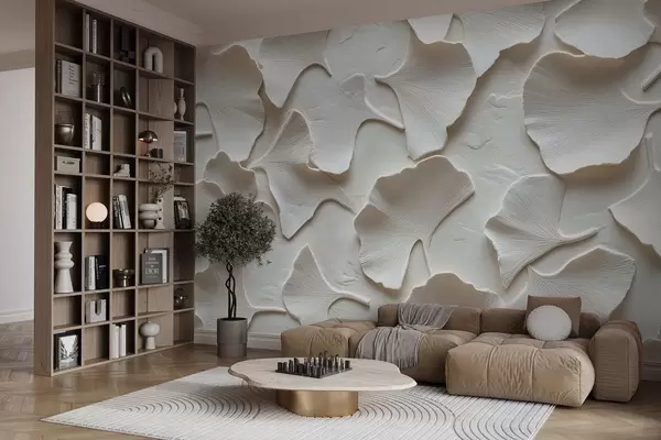 Fototapeter Stukkatur med delikat preging av ginkgoblader på hvit bakgrunn Nr. w08560v1