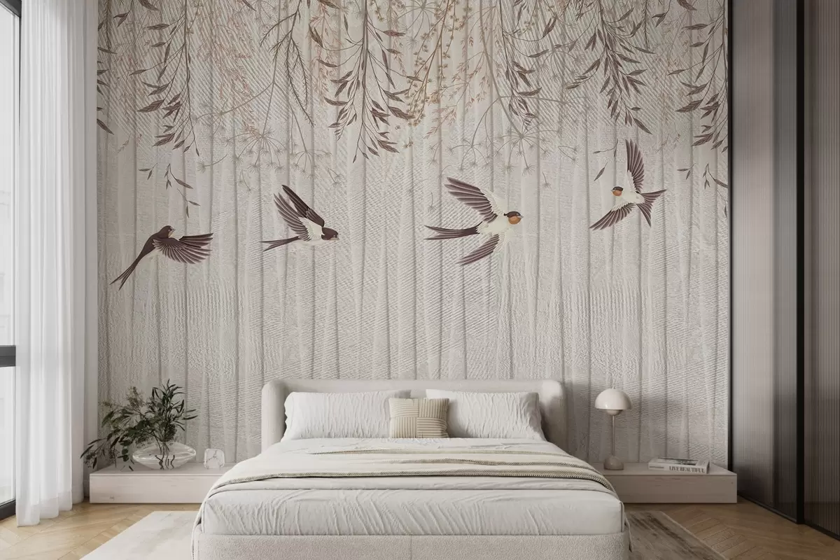 Fototapeter Flygende fugler på en strukturert bakgrunn med løvetann og blomster Nr. w08566