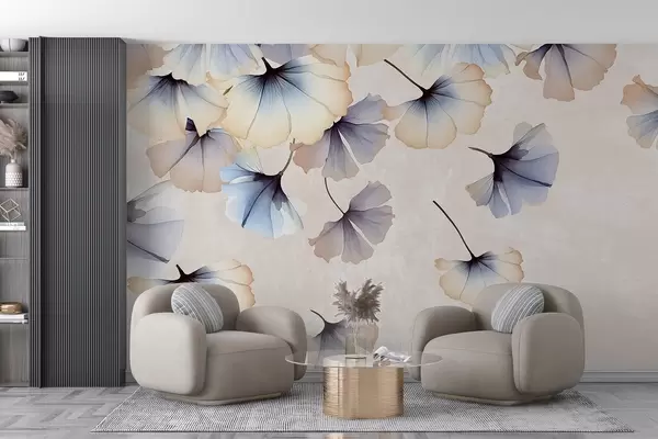 Fototapeter Pastellfargede blå og beige ginkgoblader med delikate kronblader som svever i luften mot en teksturert bakgrunn Nr. w08578