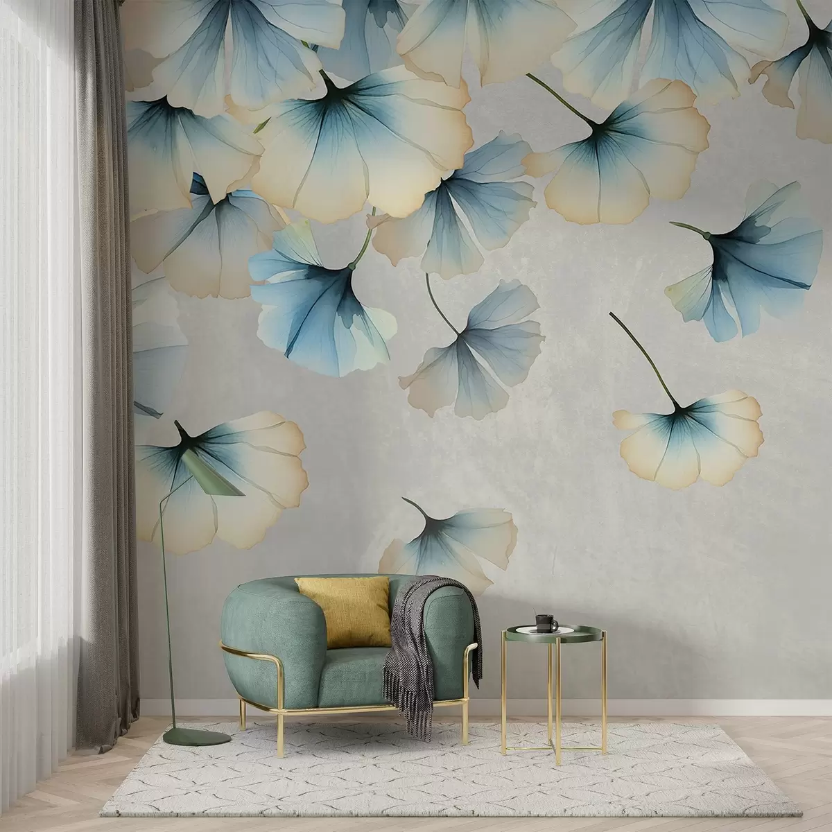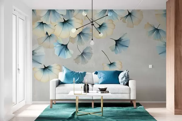 Fototapeter Pastellfargede blå og gule ginkgoblader med delikate kronblader som svever i luften mot en teksturert bakgrunn Nr. w08578v1