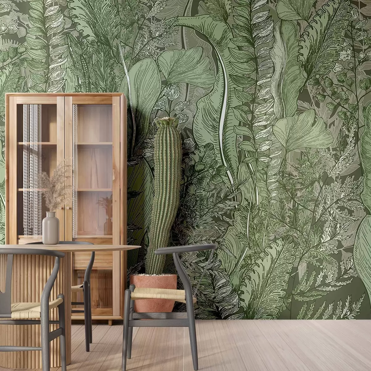 Fototapeter En frodig, grønn skog med ulike typer bregner, blader og løvverk i grønne nyanser Nr. w08579