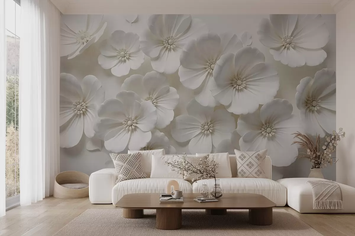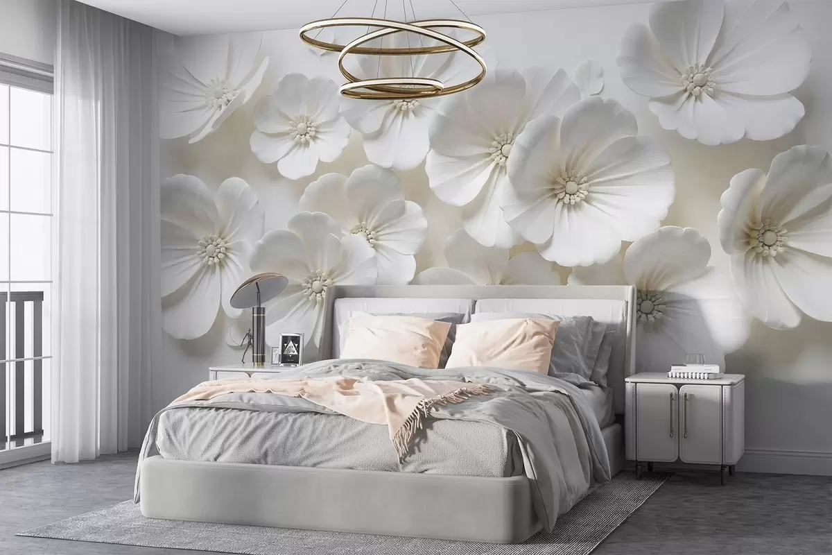 Fototapeter Hvite blomster med delikate kronblader og sentre mot en lys bakgrunn Nr. w08587