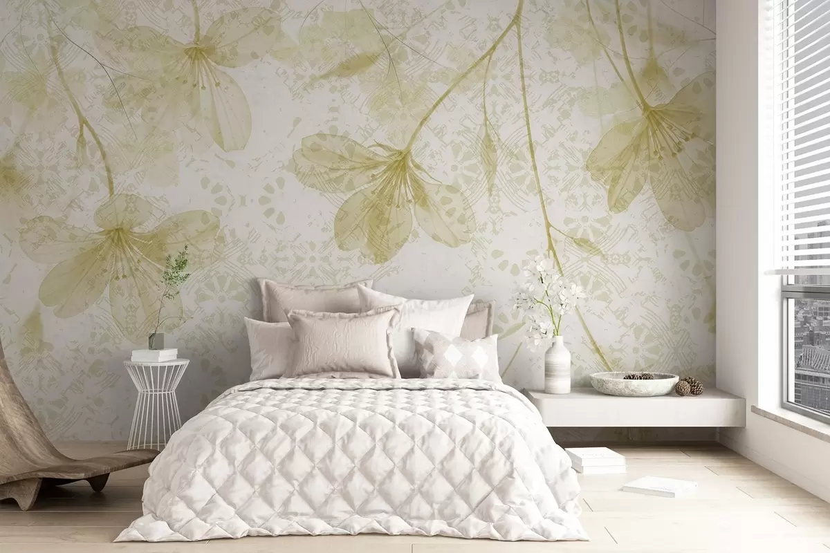 Fototapeter Delikate gule og hvite blomster med lange stilker og kronblader mot en myk, uskarp teksturell bakgrunn Nr. w08588v2
