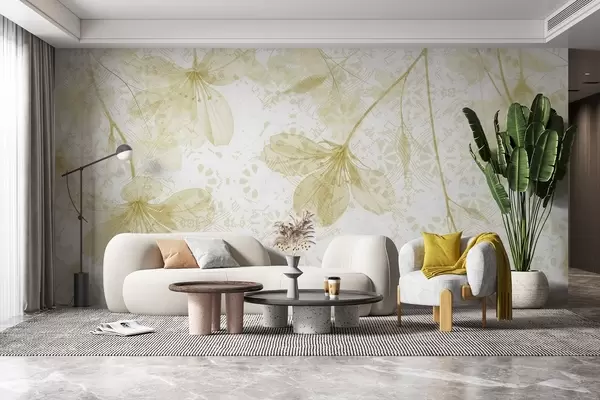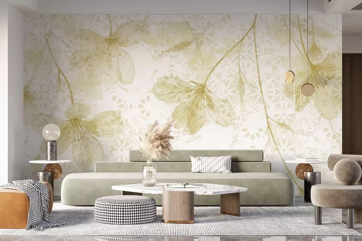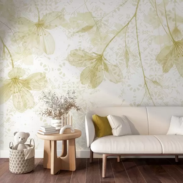 Fototapeter Delikate gule og hvite blomster med lange stilker og kronblader mot en myk, uskarp teksturell bakgrunn Nr. w08588v2