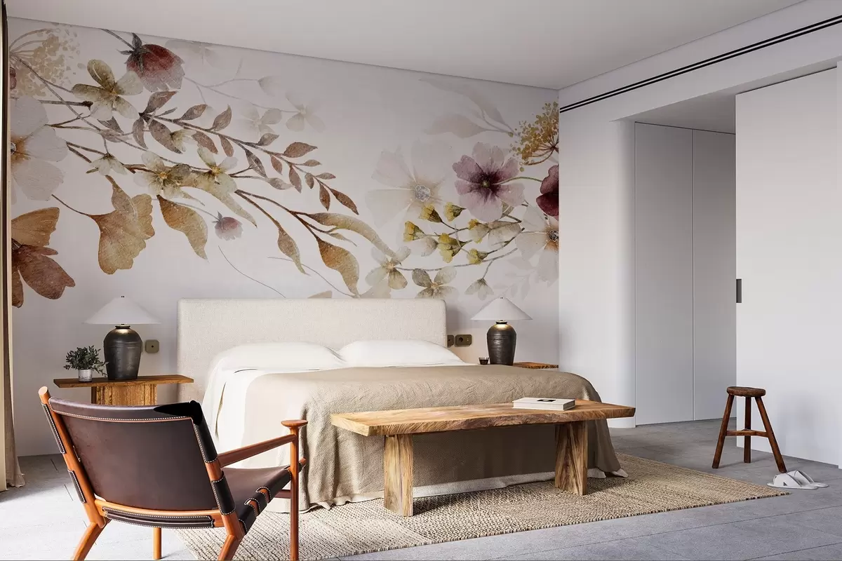 Fototapeter Blomsteroppsats med myke, dempede farger med beige og hvite blomster og blader mot en lys bakgrunn Nr. w08603