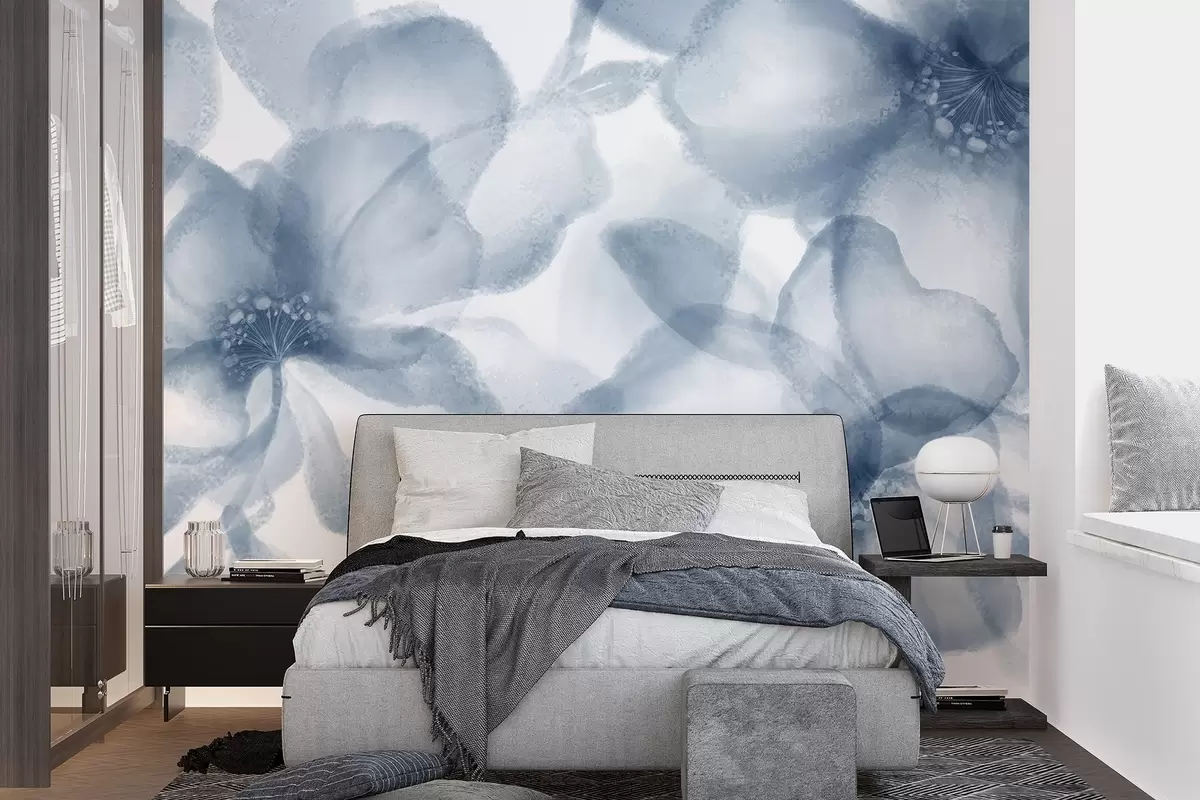 Fototapeter Myke, uskarpe, abstrakte blå blomster skaper et rolig og beroligende blomstertrykk Nr. w08607