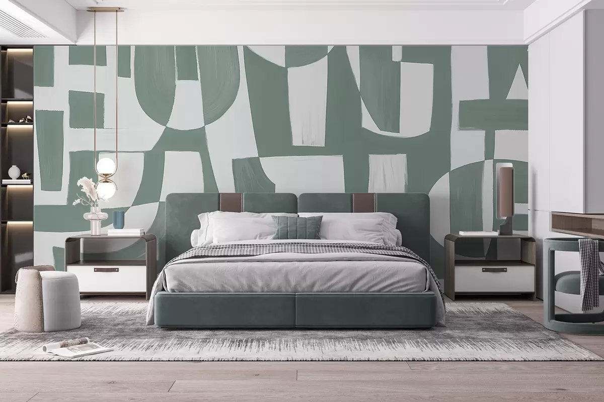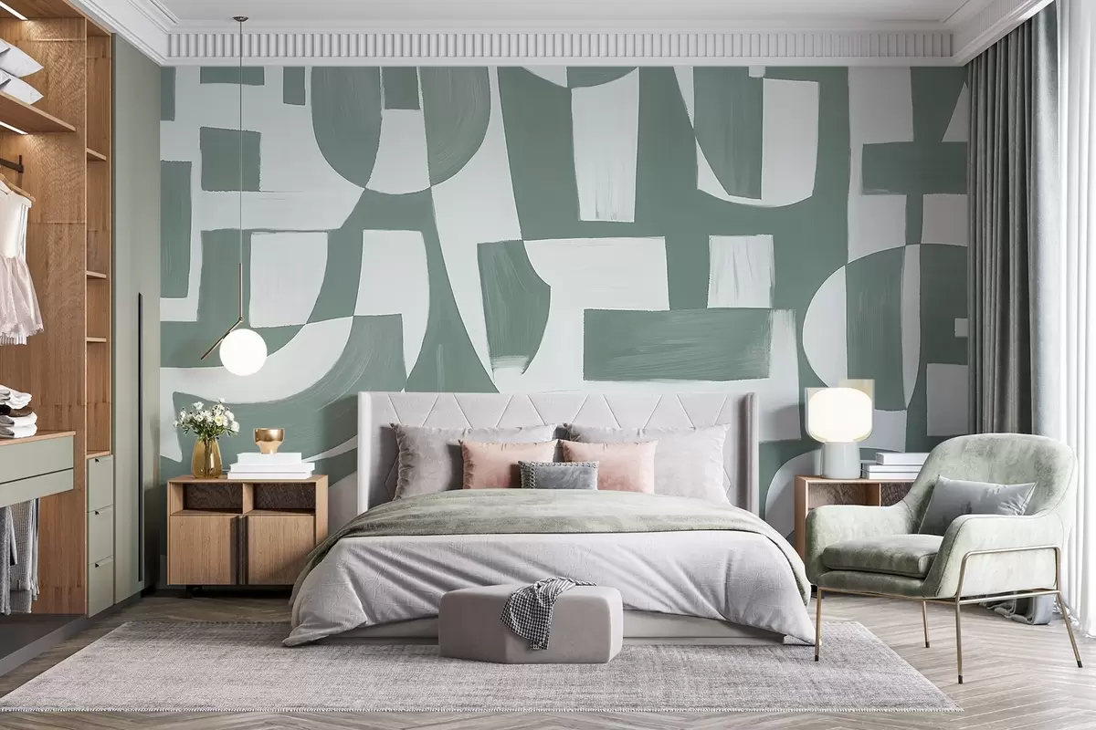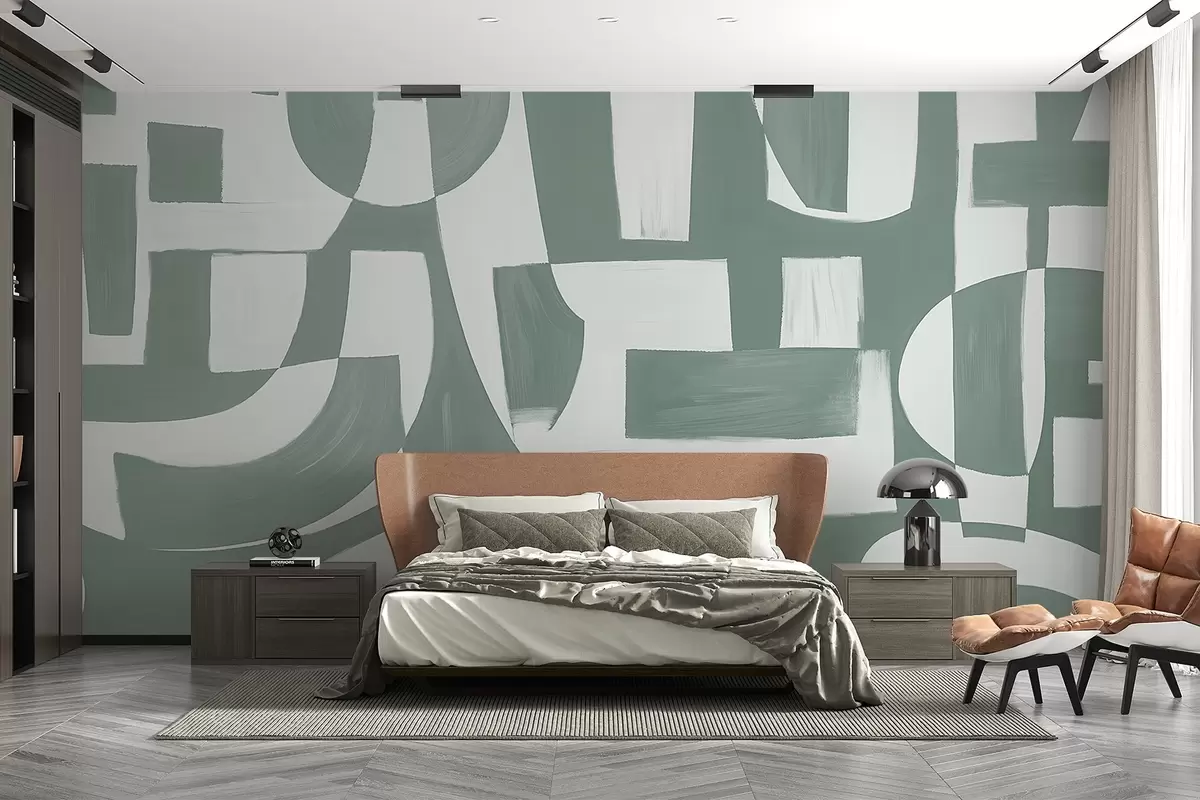 Fototapeter Abstrakte geometriske former og mønstre i grønt og hvitt skaper en visuelt slående og dynamisk komposisjon Nr. w08608v1